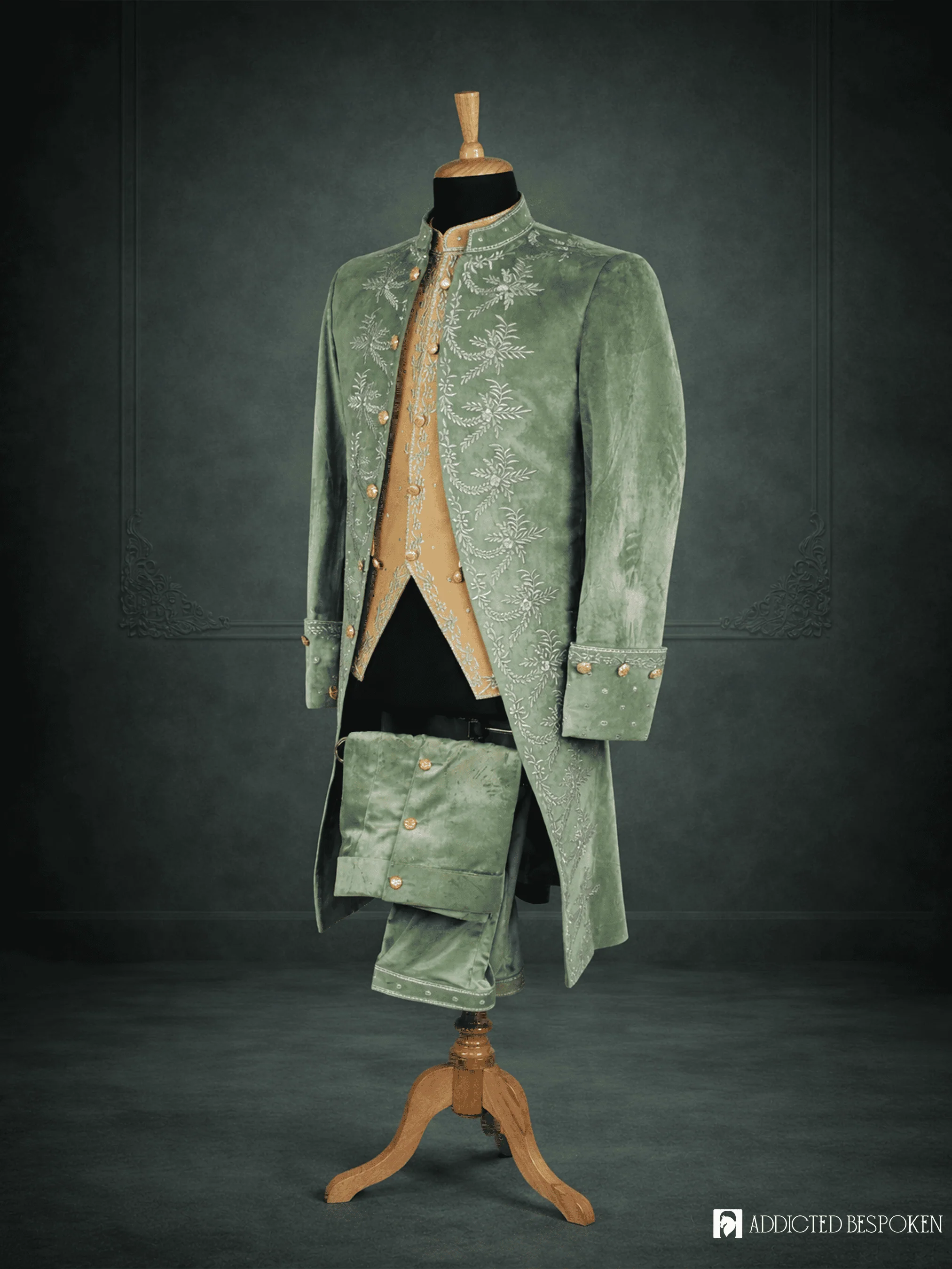 This 1800s Fersen Court Suit is made from the finest cotton and luxurious velvet fabric. An elegant silver embroidery, a cotton waistcoat, a long coat with box pleats on the back, flap pockets, folded cuffs, golden buttons, and breeches below the knee are some of the highlights.