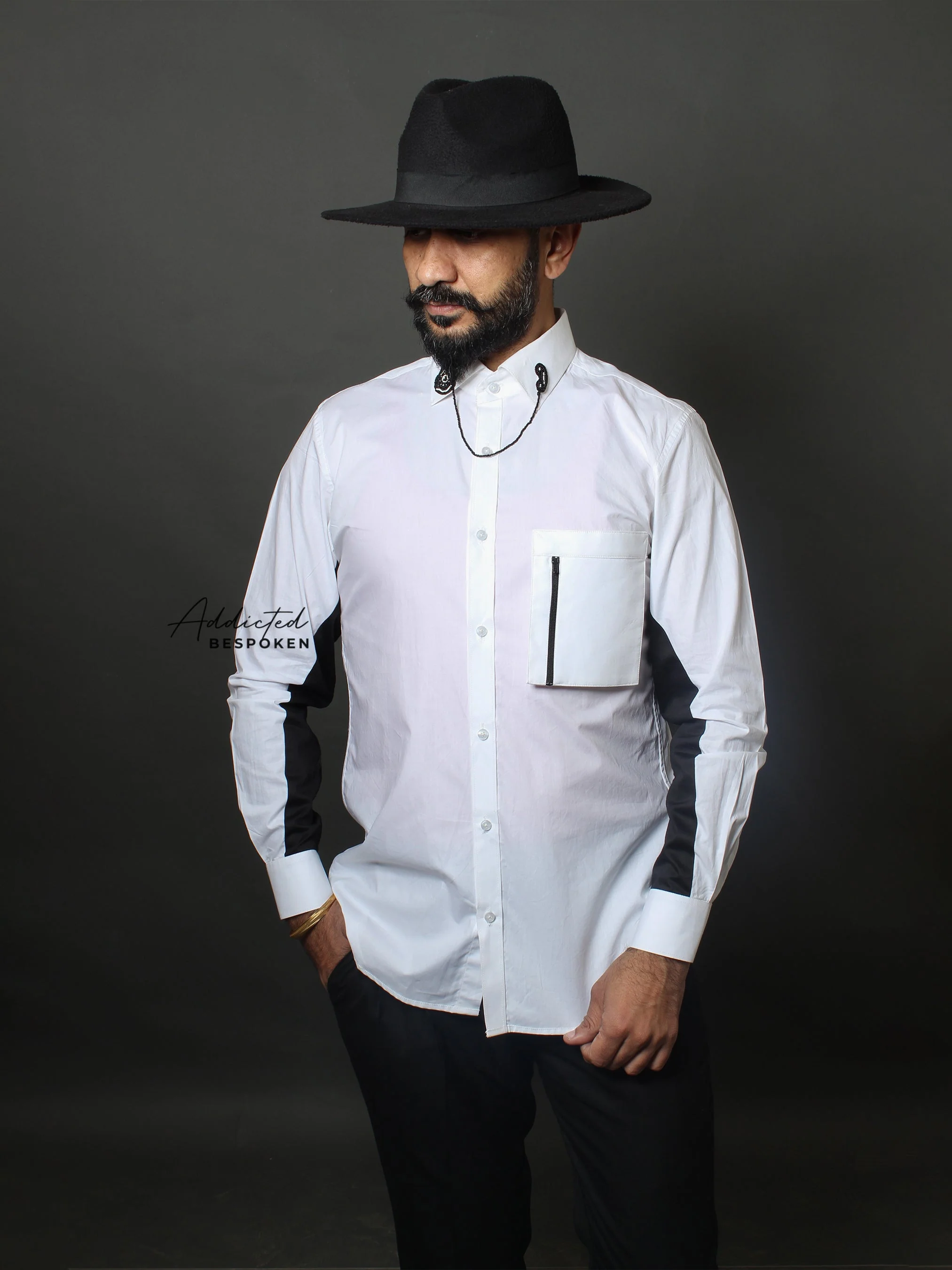 This men's custom-made shirt described here exudes a distinctive blend of style and innovation. Crafted from high-quality cotton, adding a touch of functionality and modernity, the back of the shirt is a canvas for artistic expression with a printed ribbon, showcasing intricate patterns or designs that enhance both the aesthetic and utility of the garment. This piece transcends conventional menswear, embodying the essence of aesthetic apparel by seamlessly fusing creativity, functionality, and a keen eye for design. It stands as a testament to the intricate artistry and forward-thinking approach of contemporary men's fashion.