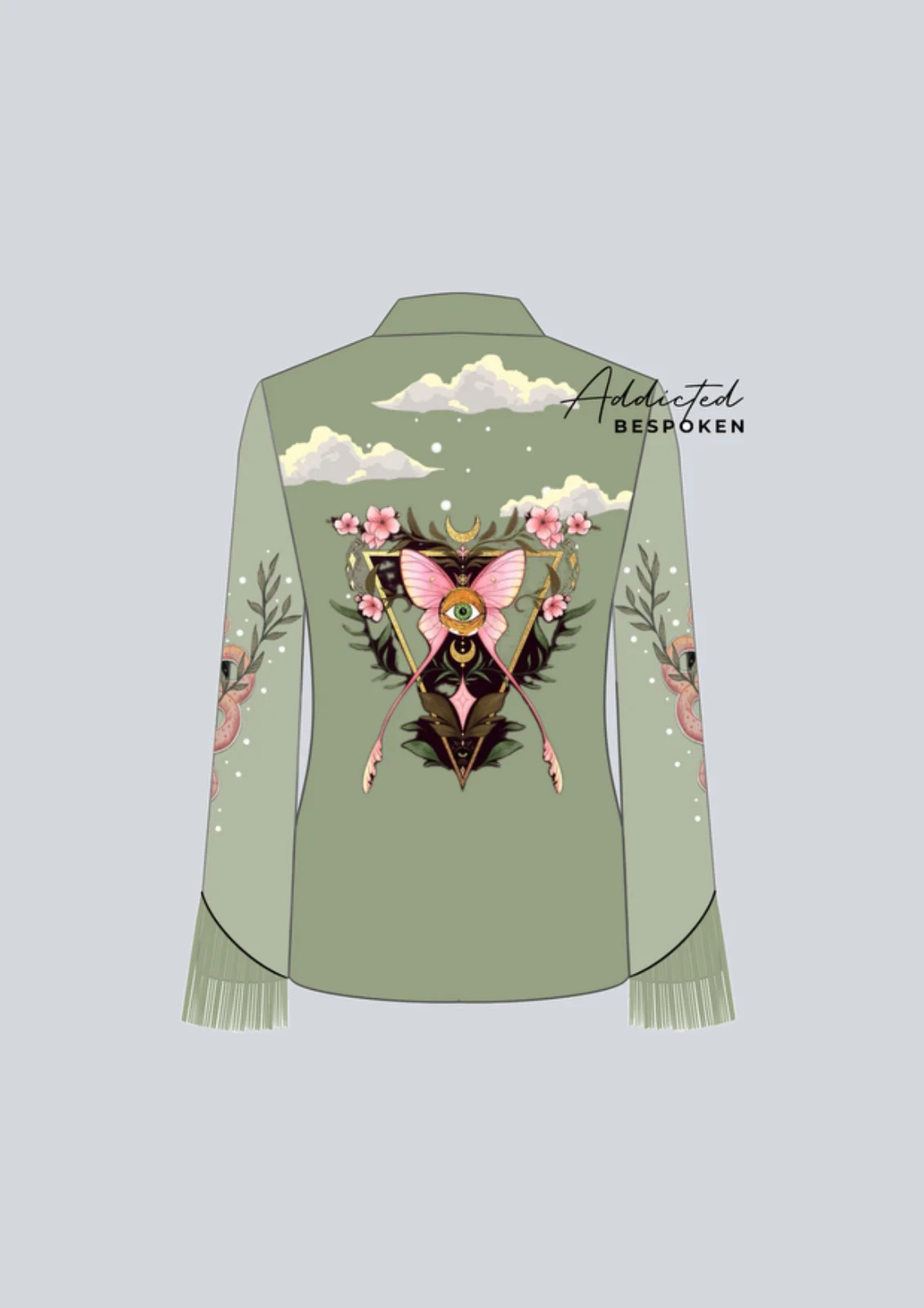 This Enchanting ensemble combines nature-inspired elements with cosmic beauty. The tailored blazer features intricate floral embroidery, celestial motifs like the sun and moon, and captivating eyes, symbolizing a mystical connection. The back showcases a mesmerizing winged figure adorned with blooming flowers and symbolic details, adding to its ethereal charm.