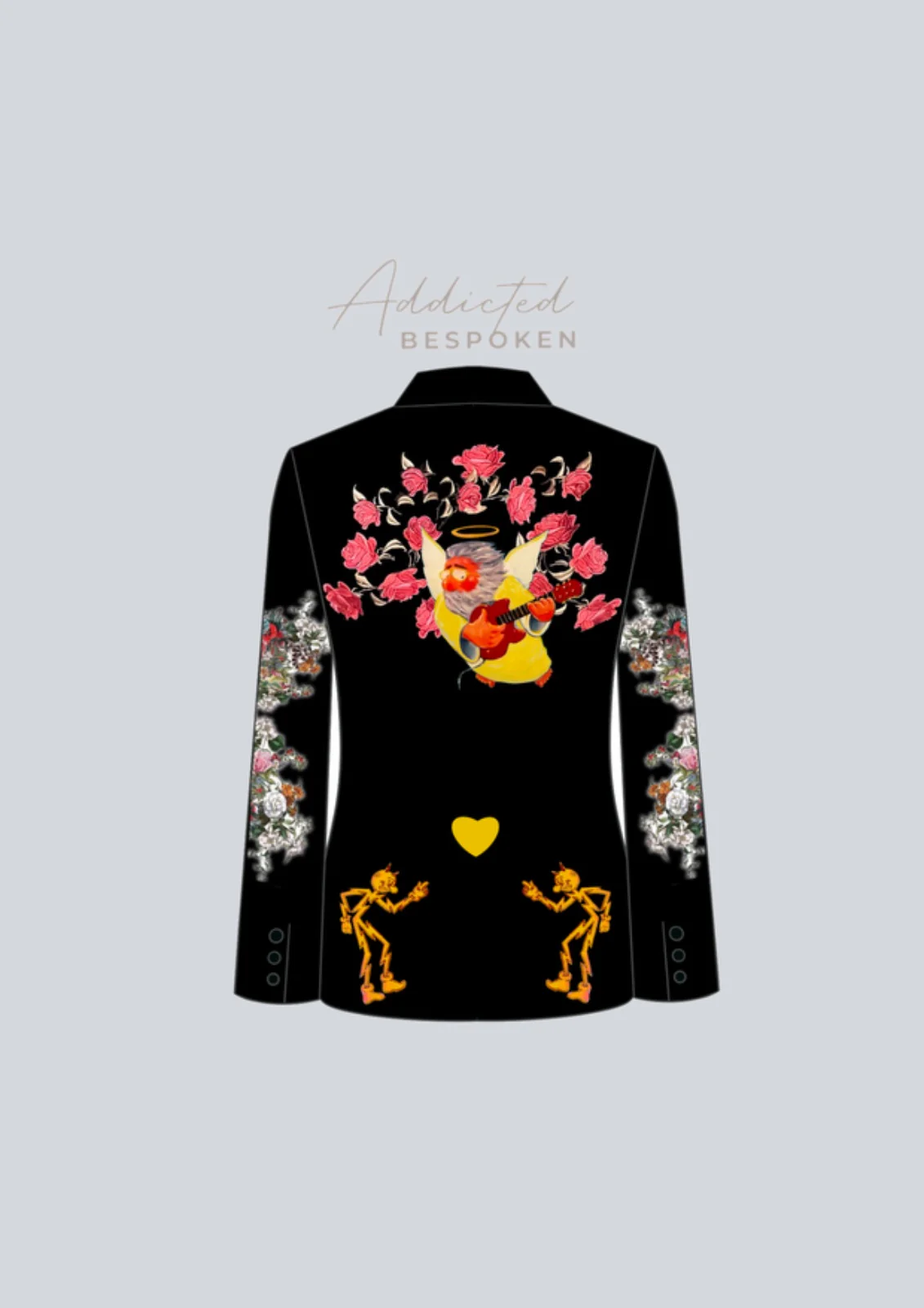Embrace the beauty of the afterlife with our bespoke suit set. This black ensemble features intricate skull embroidery, floral motifs, and a captivating angel design. A perfect blend of elegance and gothic style, this suit is a statement piece that exudes both sophistication and individuality.