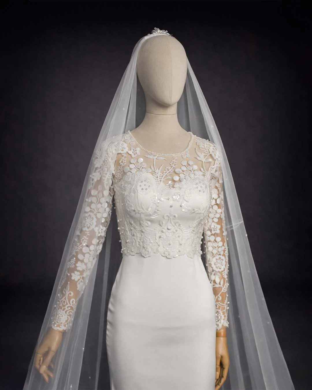 A timeless satin bridal gown featuring a fitted silhouette, a delicate embroidered lace bodice, and sheer full-length sleeves. Paired with a chapel-length veil, this gown offers a graceful, romantic look for modern brides. Perfect for weddings seeking sophistication, elegance, and subtle glamour with a smooth satin drape that photographs beautifully.