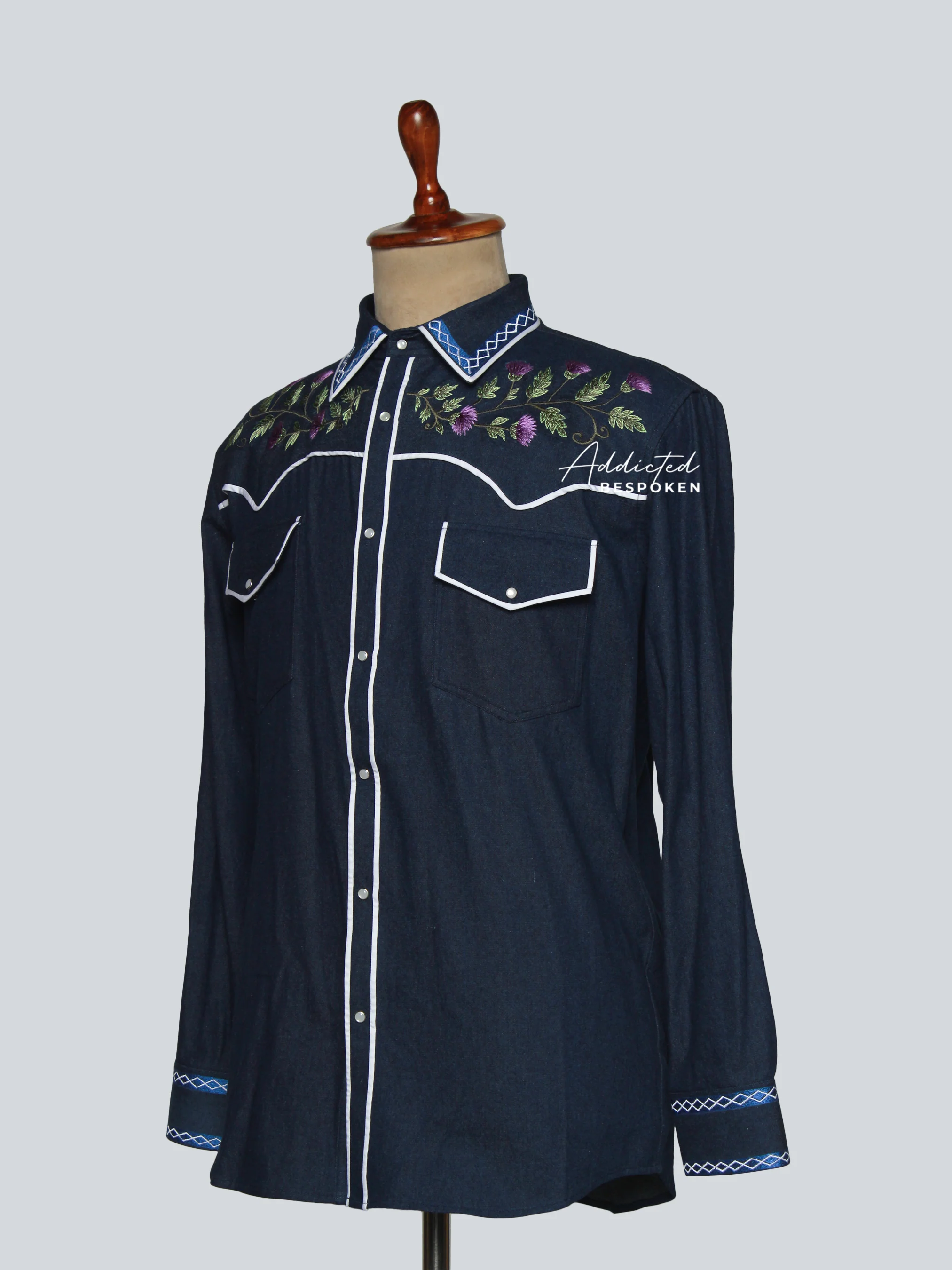 Add a bold western flair to your wardrobe with the Embroidered Western Denim Shirt. Crafted from durable denim, this embroidered shirt features vibrant floral designs and classic cowboy details like pointed yokes and snap buttons. Perfect for a cowboy costume, themed parties, or everyday standout looks, this cowboy shirt delivers rugged charm with refined styling. Whether you're dressing up for a rodeo or down for casual outings, it blends tradition with trend effortlessly.