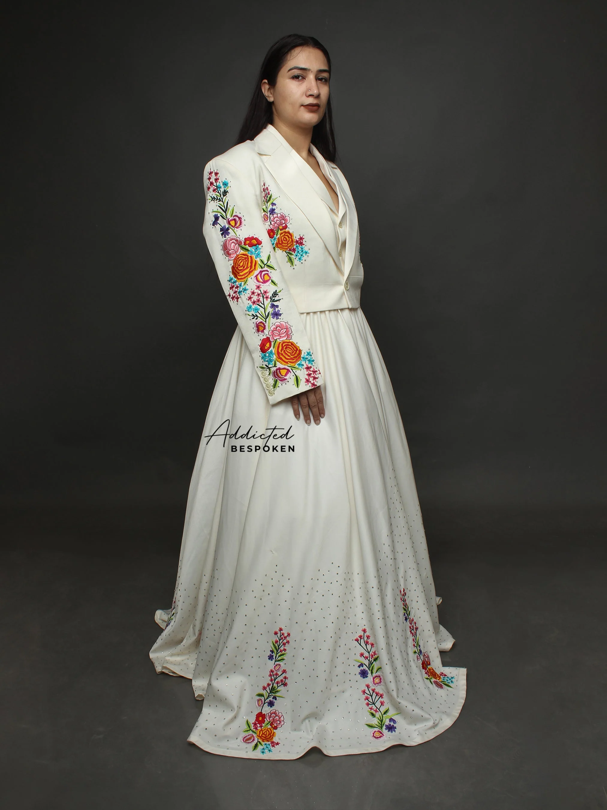 Discover elegance with the 3-piece wedding dress suit for women. This white Western cowboy skirt suit exudes charm, featuring customized rhinestone-encrusted embroidery. A perfect blend of sophistication and flair, this outfit is ideal for bridesmaids or cocktail events. Elevate your style with the exquisite craftsmanship, setting you apart in this unique ensemble.