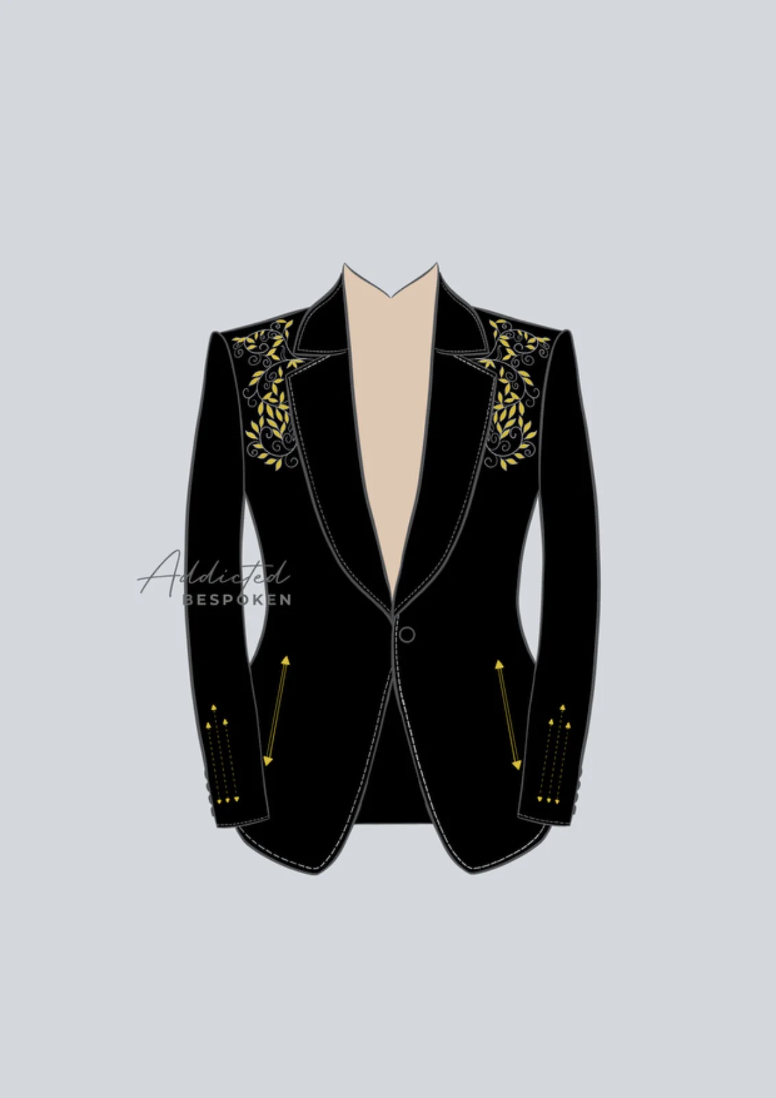 This Striking Western-inspired ensemble features a sleek single-button blazer adorned with intricate golden embroidery of bees and floral motifs. The back of the blazer and trousers highlight elegant matching patterns, showcasing attention to detail and craftsmanship. Complete with a statement hat featuring a bold golden bee design, this outfit exudes luxury and sophistication, perfect for making a bold yet refined statement. Ideal for formal western-themed events or fashion-forward occasions.