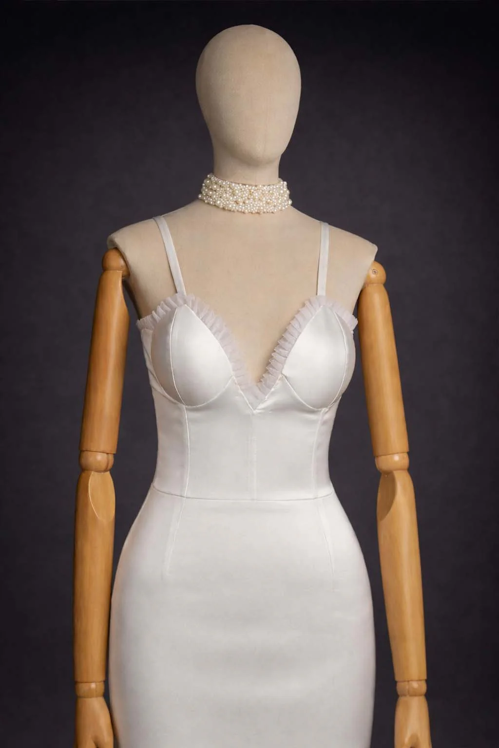 A stunning satin mermaid bridal gown designed with a deep V-neck bodice, soft pleated detailing, and an adjustable corset back for a sculpted fit. The gown flares into a delicate tulle mermaid hem, adding romantic volume. Perfect for modern brides seeking a sleek, feminine silhouette with luxurious satin shine and elegant contouring.