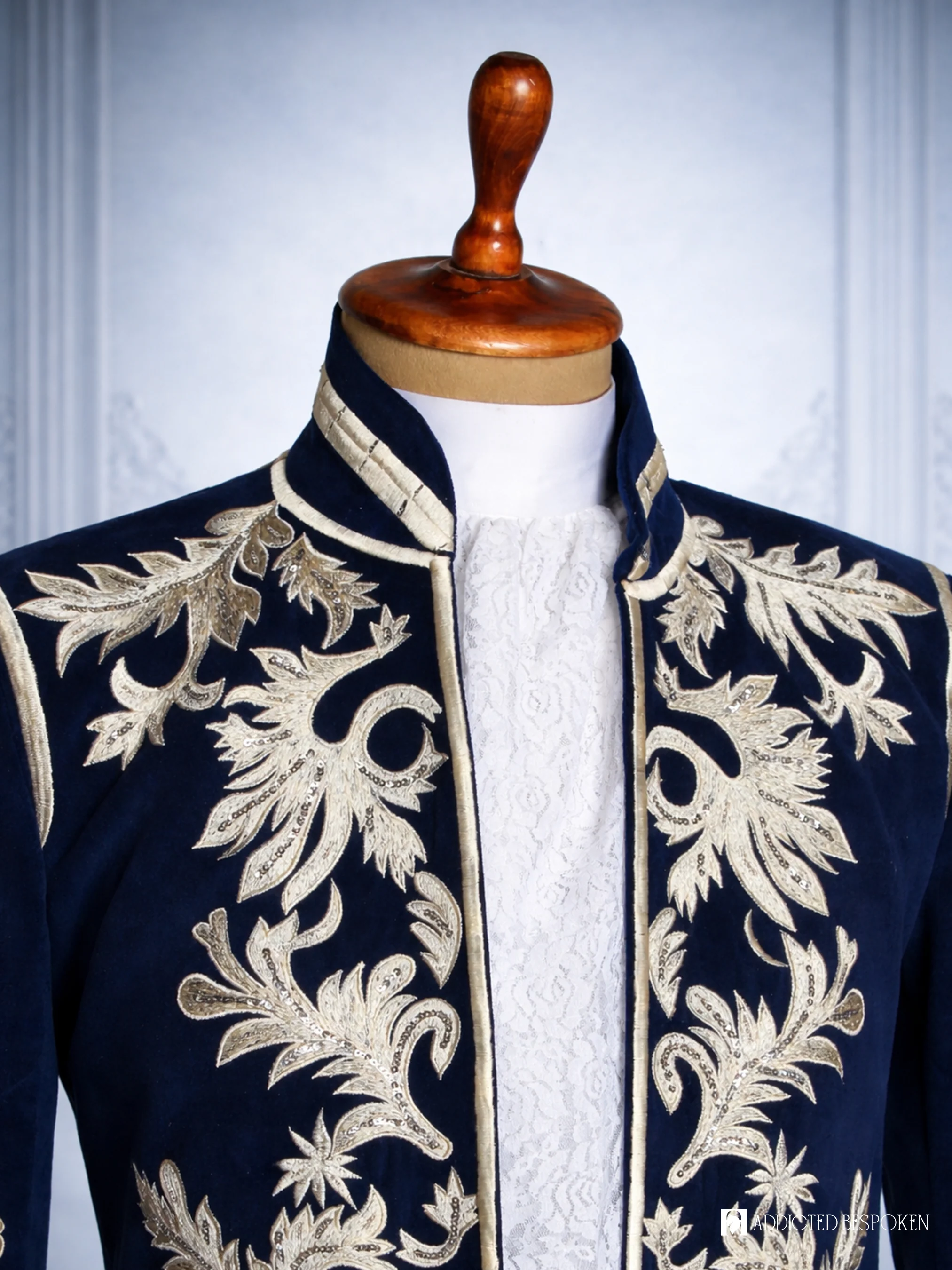 Step into aristocratic elegance with the Palace Legacy Formal Suit by Addicted Bespoken. This Rococo coat features opulent gold embroidery over a rich navy base, adorned with baroque leaf motifs and lace cuff details. Inspired by the grandeur of 18th-century European courts, it blends historical romance with modern couture finesse. Ideal for ceremonial occasions, royal-themed events, or statement fashion moments, this masterpiece embodies timeless sophistication and handcrafted excellence in every thread.