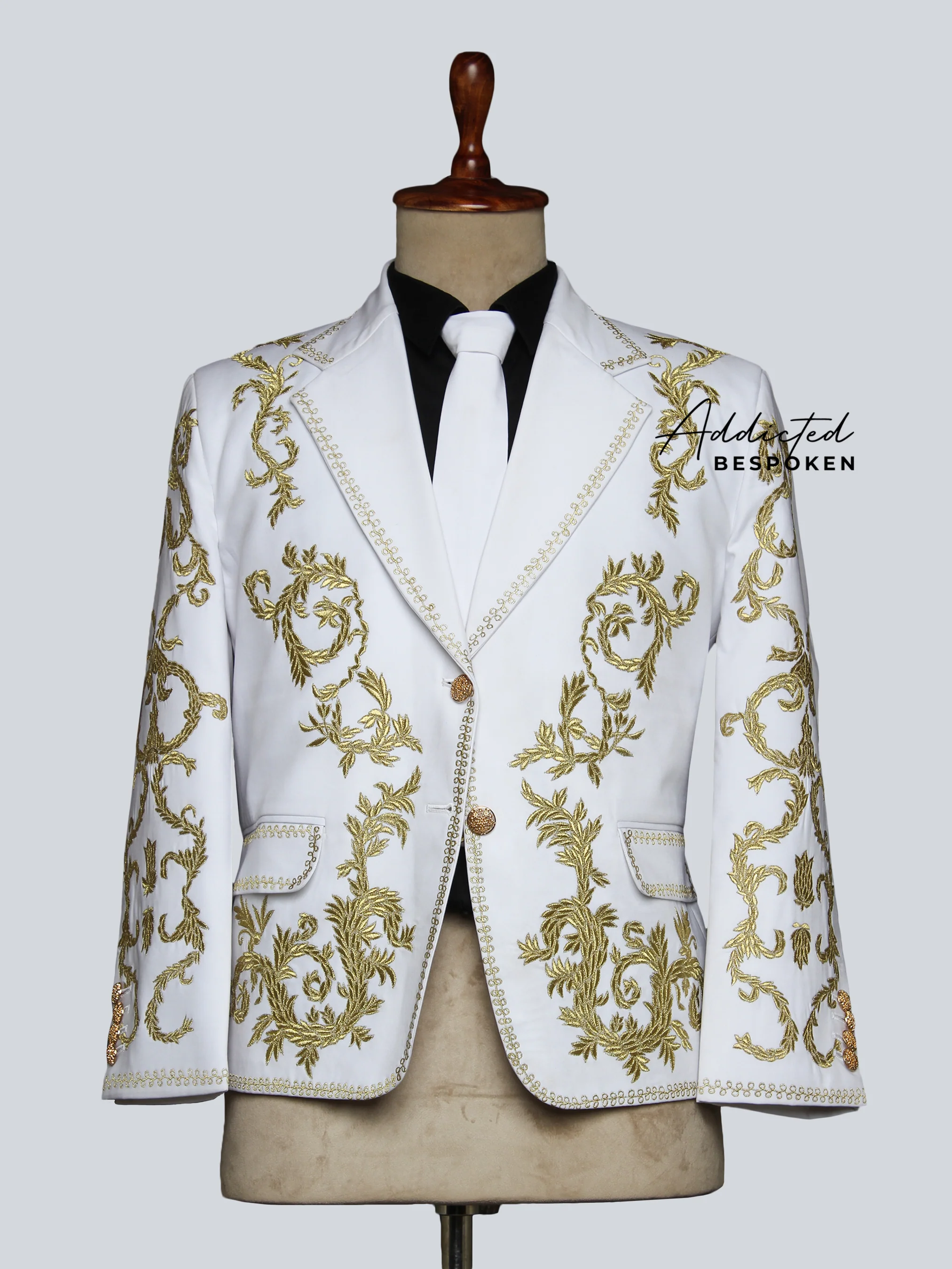 This Bespoke white Regal Grandeur Tailored Suit showcases luxurious golden embroidered notch lapels. Perfect for weddings, cocktail parties, and proms, it offers a timeless and sophisticated look, ensuring you stand out on any special occasion.