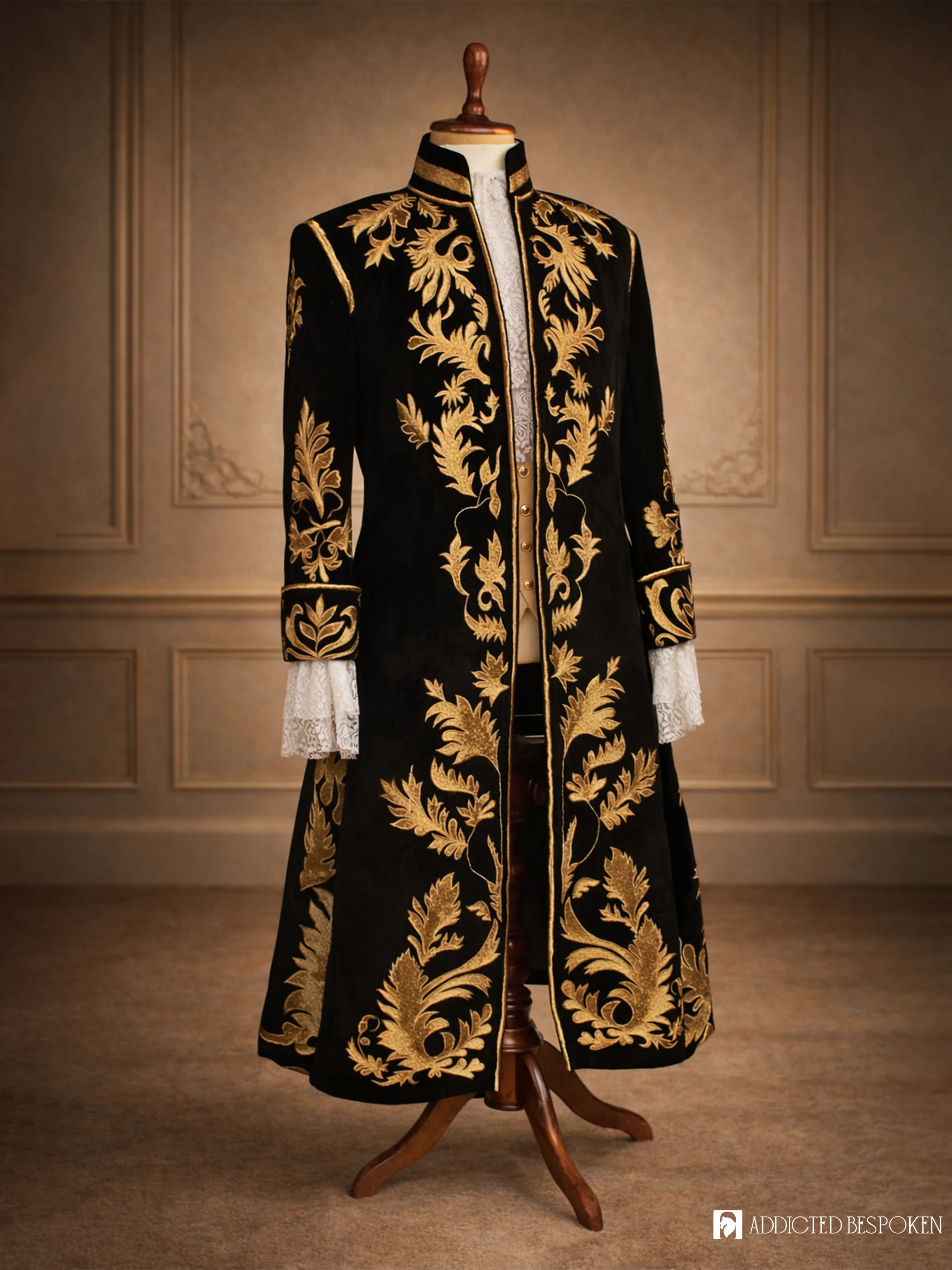 The Regal Rococo Embroidered Suit captures timeless European grandeur with a modern edge. Handcrafted in luxurious black velvet and adorned with intricate gold embroidery, this long ceremonial coat blends sophistication with royal artistry. Inspired by 18th-century Rococo opulence, itās perfect for weddings, receptions, stage performances, or red-carpet appearances.