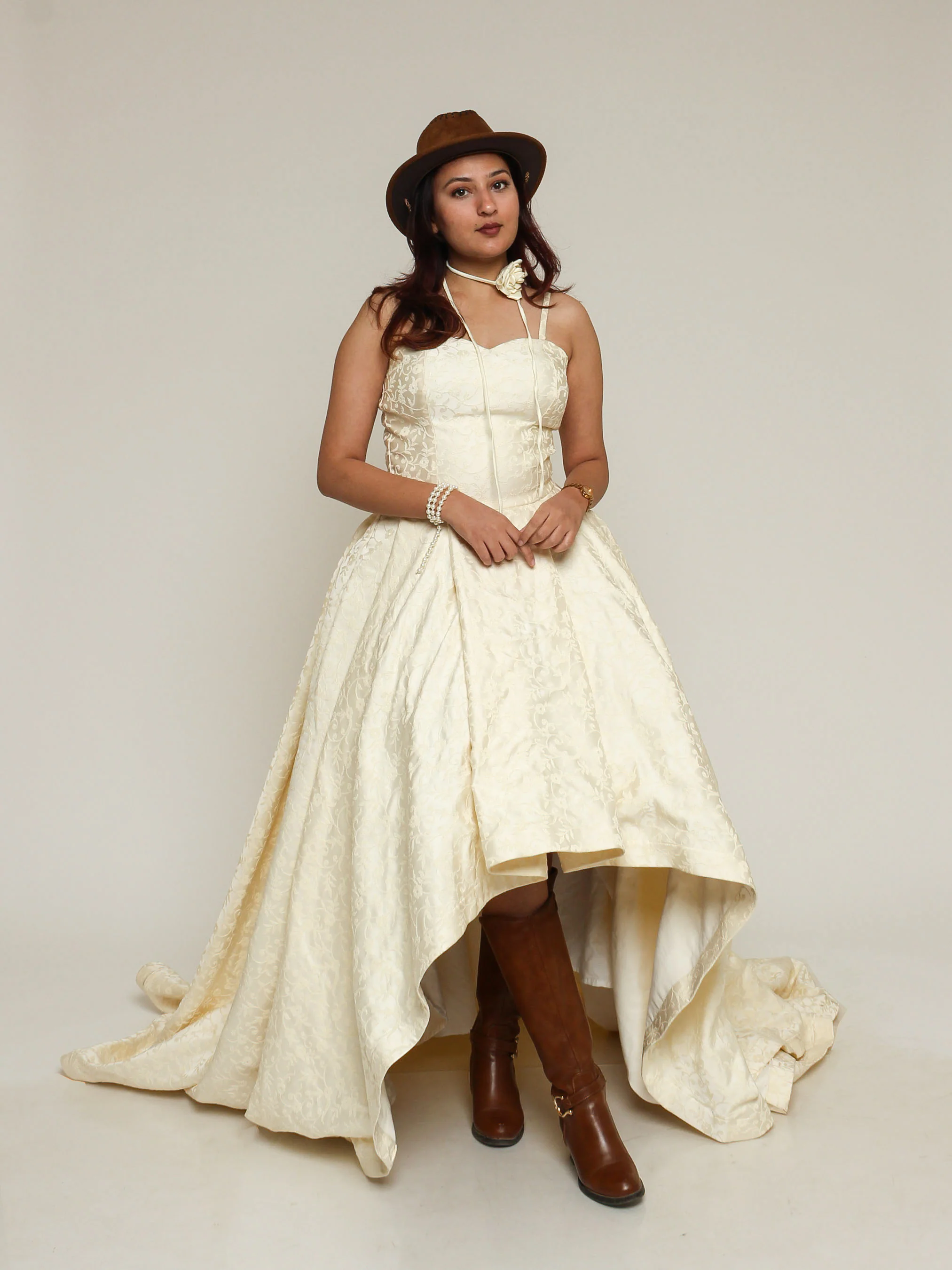 Inspired by Rococo elegance and Western bridal charm, this luxurious brocade gown features a sculpted corset bodice, voluminous skirt, and refined detailing for a timeless silhouette. Paired beautifully with cowgirl accessories, itās the perfect couture choice for country weddings, rustic ceremonies, bridal photoshoots, and brides seeking vintage romance with modern Western flair.