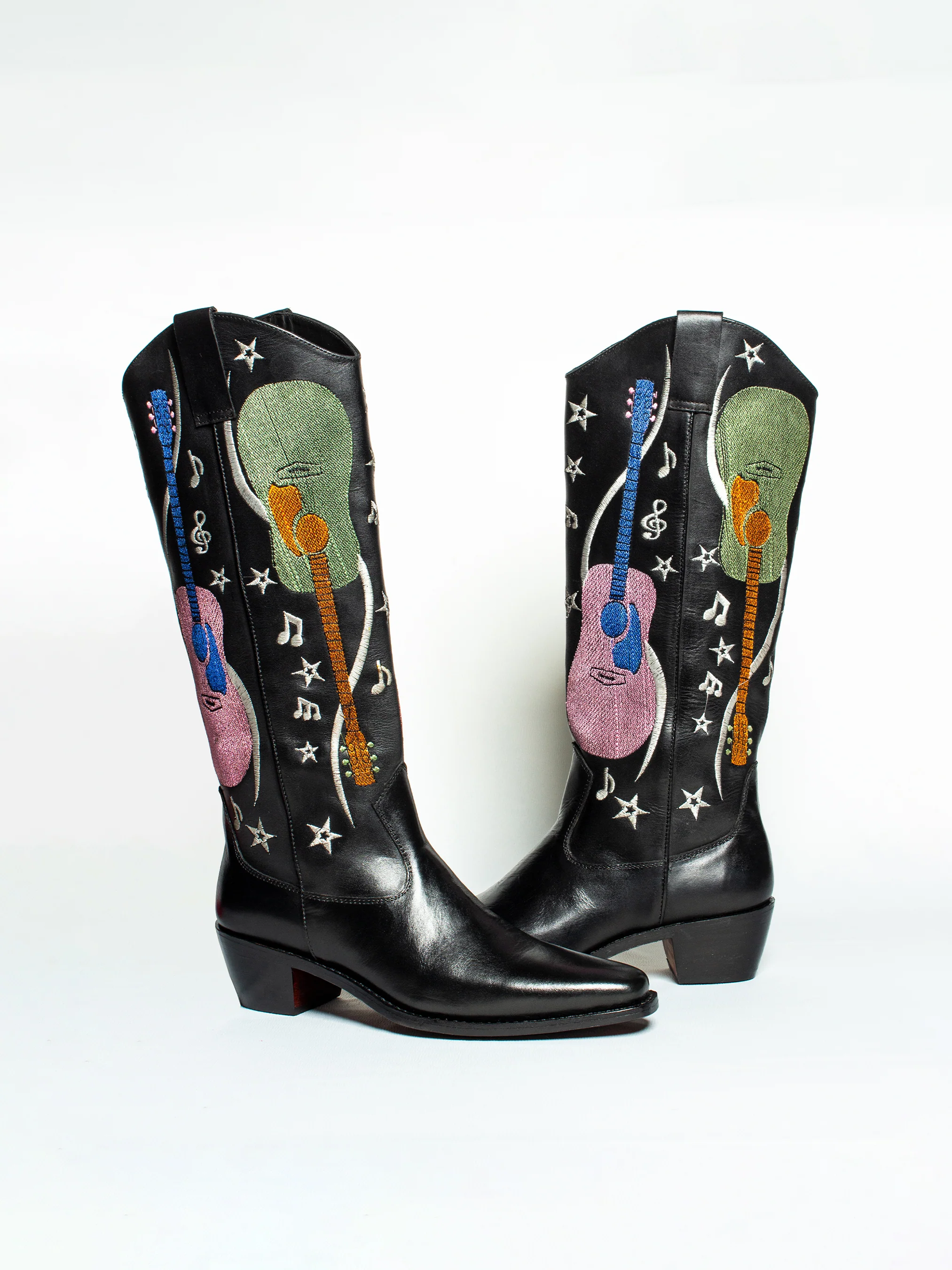 Step into the spotlight with these striking handcrafted black leather cowboy boots, designed for those who live and breathe music. Featuring intricate, multicolored embroidered guitars, music notes, and celestial stars, these boots are a true work of art. Made from premium full-grain leather with a sleek finish, they offer durability and long-lasting wear. The Goodyear welt construction ensures superior craftsmanship and comfort, while the square toe and sturdy heel provide a classic Western silhouette. Whether you're on stage, at a festival, or simply want to make a bold statement, these boots bring rhythm and style to every step.