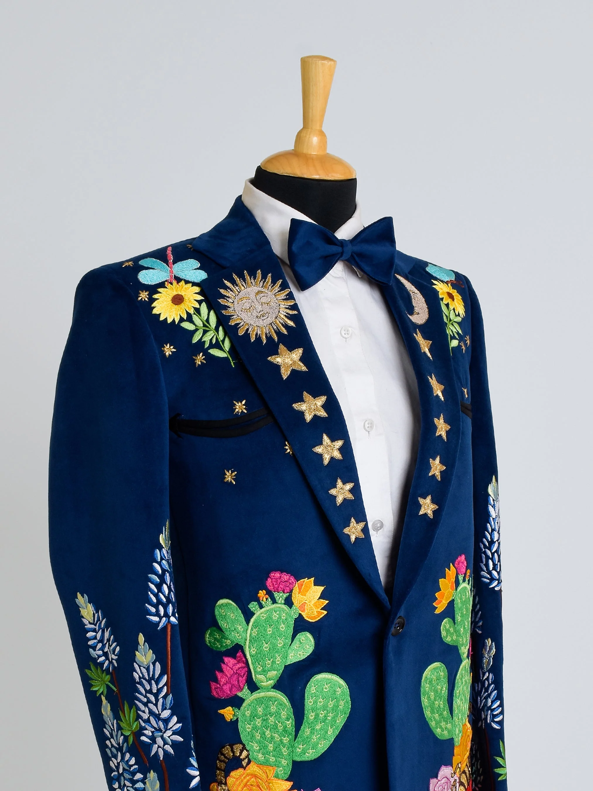 This Wilderness Cacti Western Suit is made from luxurious velvet fabric. Immerse yourself in a captivating world where the desert landscape comes alive with blooming flowers, majestic lions, and enchanting crabs. This exquisite suit is a testament to the harmony between boldness and elegance, featuring intricate embroidery that captures the essence of a lively fiesta. Crafted with meticulous attention to detail and tailored to perfection, this ensemble promises both comfort and style.